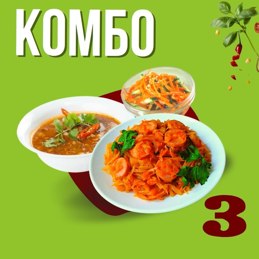 Дост. КОМБО: Суп Харчо, Салат морковь огурец, капуста тушеная с сосисками