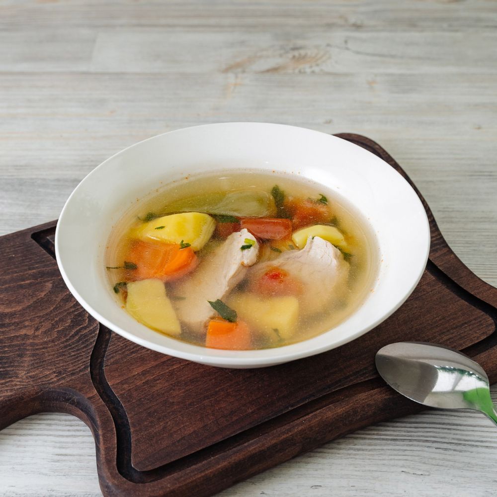 Бульон куриный, картофель, морковь, лук репчатый, помидоры, перец, чеснок, зелень, приправы, соль